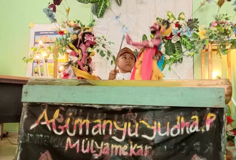 Kelincahan tangannya memainkan wayang yang diiringi musik khas pewayangan membuat kepala sekolah, para guru, hingga teman-temannya terpikat menyaksikan penampilannya.
