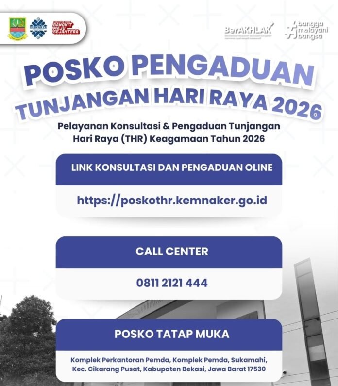 BEKASI – Dinas Ketenagakerjaan (Disnaker) Kabupaten Bekasi membuka Posko Pengaduan Tunjangan Hari Raya (THR) bagi para pekerja atau buruh yang mengalami kendala dalam penerimaan haknya menjelang Hari Raya Keagamaan. Posko tersebut disiapkan sebagai sarana konsultasi serta penampungan laporan dari pekerja terkait kewajiban perusahaan dalam pembayaran THR.