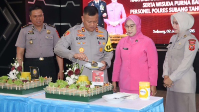 SUBANG – Polres Subang menggelar kegiatan syukuran kenaikan pangkat Personel Polri dan ASN, sekaligus memperingati Hari Jadi Intelijen Polri ke-80 Tahun 2026, serta Wisuda Purna Bhakti Personel Polres Subang Tahun 2025, bertempat di Aula Patriatama Polres Subang, Jumat (2/1/2026).