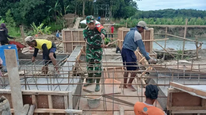 Tampak Babinsa bersama masyarakat bahu-membahu menyelesaikan tahap perakitan rangka besi, dan penguatan pondasi. Struktur utama jembatan mulai terbentuk, meskipun saat ini belum sepenuhnya terhubung.